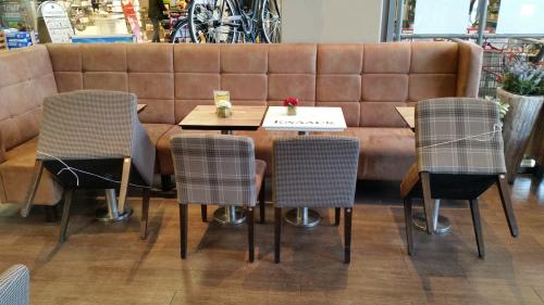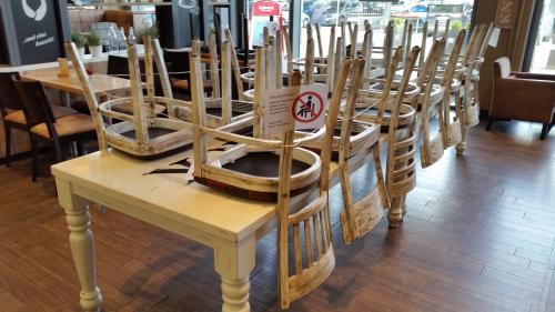 An einem langen Tisch, wo sonst 12 Personen Platz nehmen können, ist das sitzen verboten, die Stühle sind hochgestellt. An den normalen Tischen sind 1,5-2 Meter Lücken entstanden, weil jeder 2. Tisch leer bleiben muss.