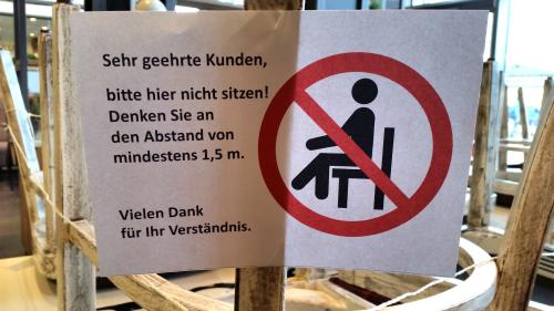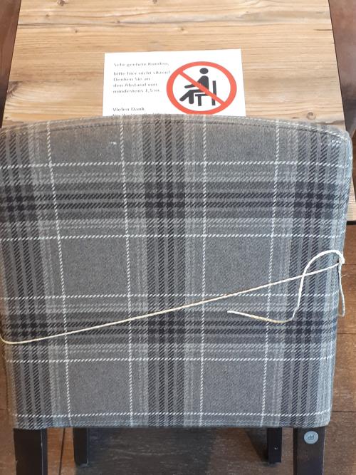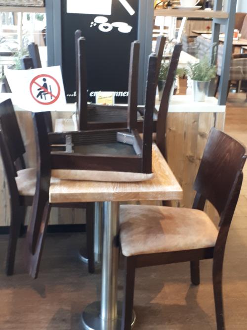 An einem langen Tisch, wo sonst 12 Personen Platz nehmen können, ist das sitzen verboten, die Stühle sind hochgestellt. An den normalen Tischen sind 1,5-2 Meter Lücken entstanden, weil jeder 2. Tisch leer bleiben muss.