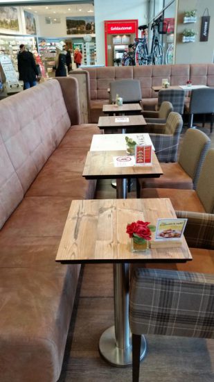 Die Mitarbeiter müssen echt ständig achtsam sein, denn immer wieder setzen sich Kunden falsch hin, oder rücken sich zu sehr auf den Leib, halten also die ca 2-Meter-Regel nicht ein.