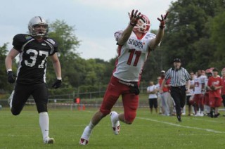 07:00 Laurents Mohr 10-Yard-Pass von Zane Zebrasky (Kick Colin Harms)