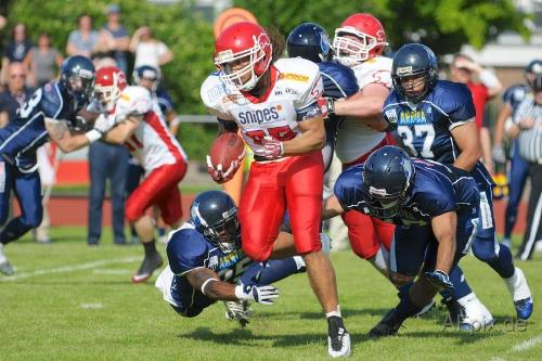 Foto: Torsten Bolten (Drei Touchdowns von Mike Davis reichten nicht zum Sieg für die Cougars) – Jetzt wird es ganz eng für die Lübeck Cougars in ihrer ersten Saison in der German Football League (GFL): In einer dramatischen Partie verloren die “Berglöwen” als bis dato Vorletzter mit 37:40 (10:14) gegen Schlusslicht Hamburg Blue Devils – und zieren nun selbst das Tabellenende. Eine letzte Chance haben die Cougars jetzt noch, die Abstiegsrelegation gegen den Meister aus der 2. Liga zu verhindern: Gegen die Berlin Adler muss in einer Woche ein Sieg her – und die Blauen von der Elbe müssen in Dresden verlieren.