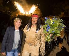 Mit einer großen „1000“, umgeben von Feuerwerksfontänen, beglückwünschten die Karl-May-Spiele Bad Segeberg am Freitagabend nach der Vorstellung von „Winnetou III“ ihren Hauptdarsteller Gojko Mitic zu seiner 1000. Vorstellung in der Rolle des Winnetou. Unter dem Beifalll von über 6.500 Besuchern überreichte die Geschäftsführerin der Karl-May-Spiele, Ute Thienel, Gojko Mitic im Kreis des Ensembles auf der Bühne einen großen Blumenstrauß und gratulierte zu seiner 1000. Vorstellung. Danach stießen die Mitglieder des Ensembles hinter Bühne zusammen mit Gojko Mitic auf die Rekordzahl an. Unter den Gratulanten auch Bad Segebergs Bürgermeister Hans-Joachim Hampel.