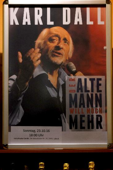231016_karl-dall_kasnitz_001Text und Fotos: TBF/Holger Kasnitz – „Der Alte Mann will noch Mehr“: Altersmilde? Fehlanzeige! Der Altmeister des gehobenen Nonsens ist zurück! Er besticht mit seinem unverwechselbaren  Humor und ist ganz dicht dran an seinem Publikum, wirklich gaannz dicht… Bei „seiner“ Zielgruppe agiert KARL DALL schlagfertig, authentisch und mit diesem sprichwörtlichen Augenzwinkern. Karl Dall gastierte am Sonntag 23.Oktober 2016 mit seinem Programm “DER ALTE MANN WILL NOCH MEHR“ im Volkstheater Geisler in Lübeck. Pünktlich um 18:00 Uhr stand der Mann aus Emden auf der Bühne.