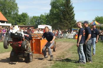 Es war schon irre, was da in Rondeshagen, Nahe Berkenthin heute den ganzen Tag bei strahlemden Sonnenschein auf dem Schaefer-Hof los war – seit 11 Jahren läuft dort schon eine Show, die Jung und Alt immer wieder von den Hockern reißt: Dort läuft nämlich der Rasenmäher-Treckertreck.Es geht darum, mit seinem Rasenmähertrecker einen Bremswagen (ein schweres Gewicht) möglichst weit zu ziehen.