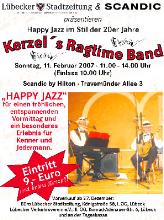 So, nun wird es aber Zeit: Entscheiden Sie sich schnell, denn am Sonntag, den 11. Februar 2007, sollten Sie unbedingt ins Scandic Hotel. Von 11 bis 14 Uhr (Einlaß 10 Uhr) werden dort die Wände wackeln, wenn die Kerzel`s Ragtime Band „Jazz der 20iger Jahre“ mit einem Top-Jazzprogramm losfetzt. Und das Scandic hat den Raum noch einmal vergrößert, darum sind an der Tageskasse noch Rest-Karten zu haben!