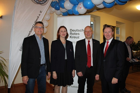 (v. li. nach rechts): Vizepräsident des DRK Lübeck Bernd Möller, stellvertretende Kreiswasserwachtsleiterin Lübeck Cindy Schmitz, Geschäftsführer des DRK Lübeck Stefan Krause, Präsident des DRK Lübeck Oliver Saggau