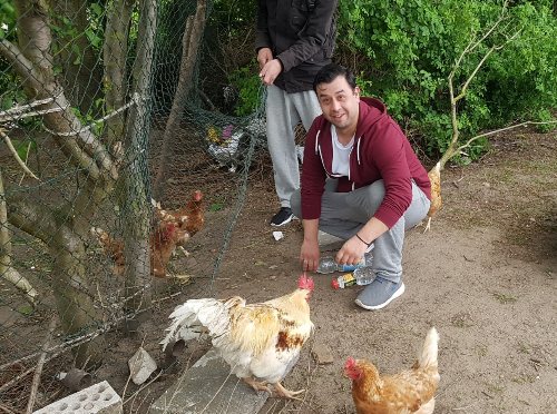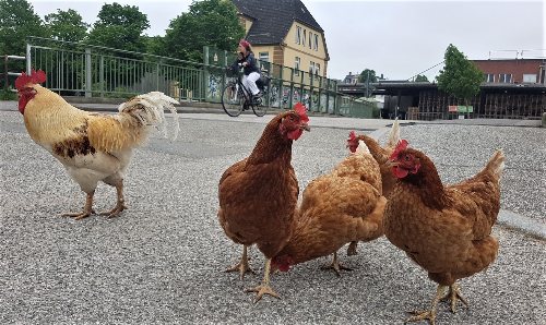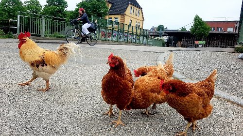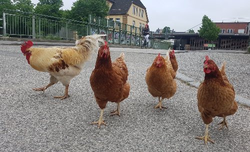 Er sagt die Hühner sind handzahm und an Menschen gewöhnt. Gestern haben sie jedoch ihr kleines Gehege an der Bahnstrecke verlassen um die Gegend zu erkunden.