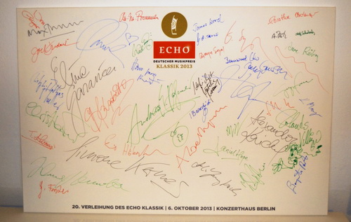 Leinwand-Final_kleinEin Herz für Kinder zeigten Preisträger, Moderatoren und Laudatoren bei der 20. Verleihung des ECHO Klassik am 6. Oktober: Während der Gala im Konzerthaus Berlin am vergangenen Sonntag signierten sie eine große ECHO Klassik-Leinwand, die ab heute, 12:00 Uhr zugunsten von „EIN HERZ FÜR KINDER“ auf www.bild.de und www.ein-herz-fuer-kinder.de versteigert wird.Insgesamt 40 ECHO Klassik-Unterschriften sind auf der Leinwand zu finden, darunter die von diesjährigen Preisträgern wie Jonas Kaufmann, Sol Gabetta, Elīna Garanča, Andreas Martin Hofmeir, Alexander Krichel, Daniel Hope, Julia Lezhneva, Simone Kermes, Vilde Frang, Max Emanuel Cencic und Max Richter. Außerdem unterschrieben Laudatoren und Prominente wie Natalia Wörner und Olaf Schubert und nicht zuletzt die Moderatoren der Verleihung, Nina Eichinger und Rolando Villazón, die ECHO Klassik-Leinwand. Rolando Villazón, bekannt für seine Karikaturen, fügte seiner Signatur eine Zeichnung seines Konterfeis hinzu.