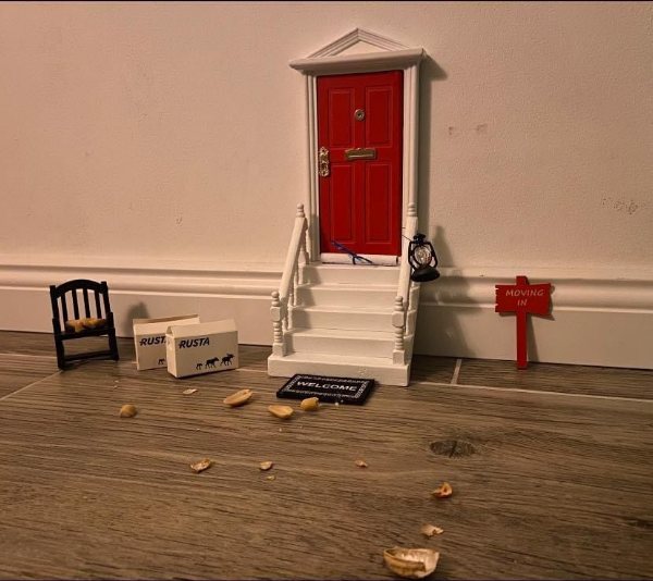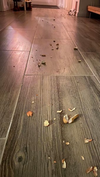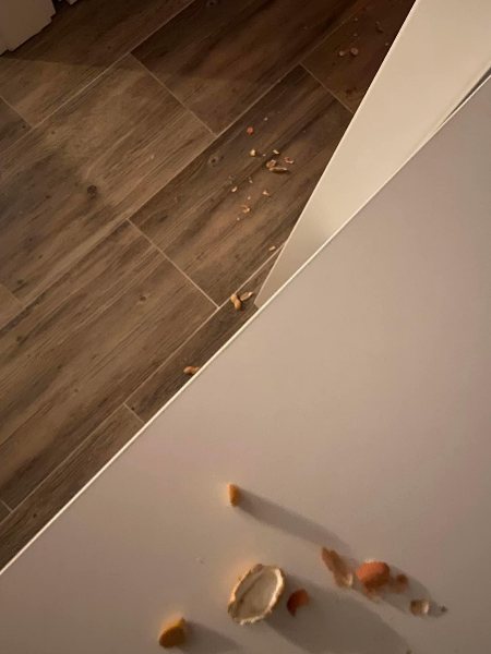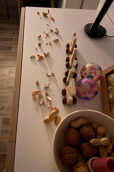 Als Nike morgens aus ihrem Zimmer in der Flur kam, dachte Sie, was ist denn hier passiert. Überall lagen Nußschalen herum. Gemeinsam mit ihrem Papa beseitige Nike mit Handfeger und Schaufel die Nußschalen.