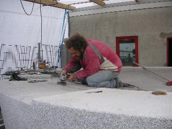 Verschiedene Oberflächenbearbeitungen gestalten in fließenden Übergängen den Wasserfluss. „Für diese anspruchvollen Arbeiten haben wir die richtigen Fachleute, die z.T. seit vielen Jahren in unserem Unternehmen als Steinmetzen tätig sind. Ein moderner Maschinenpark ermöglicht den Umgang und eine zeitgemäße Bearbeitung bei solchen Objekten. Damit gewährleisten wir, dass das Objekt letztlich auch unseren Ansprüchen an Ausführung und Qualität genügt“, sagt der Fertigungsleiter Peter Lei (41).