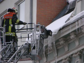 Fotos: TBF/Holger Kröger – Nun, wo der Schnee langsam schmilzt, entwickeln sich manche Eiszapfen an Häusern zur grossen Gefahr: Sie können aus grosser Höhe herunterfallen und Mesnchen treffen und schwer verletzen. Darum ist die Feuerwehr nun ständig dabei, diese Gefahrenherde zu beseitigen.