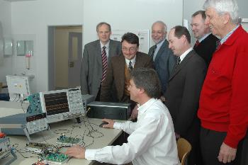 Für die Fachhochschule Lübeck nahmen der Dekan des Fachbereichs Elektrotechnik, Prof. Dr. Hermann Hochhaus, die Laborleiter Prof. Dr. Holger Dahms und Prof. Dr. Martin Ryschka sowie Laboringenieur Dipl.-Ing. Christian Knöbel die wertvollen Ausbildungsgeräte entgegen.