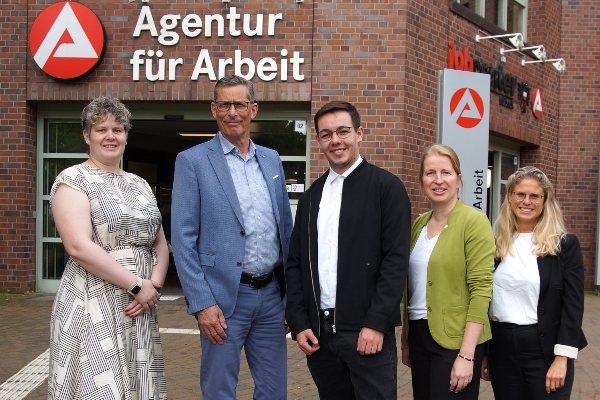 Markus Dusch (Agenturchef, 2.v.l.), Julia Simonsen (1.v.r., Fachausbilderin), Anke Dietz (Ausbilderin) und Katharina Schröter (Fachausbilderin) gratulierten Maurice Coenen.