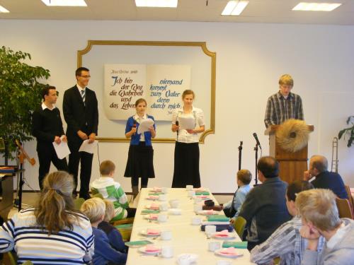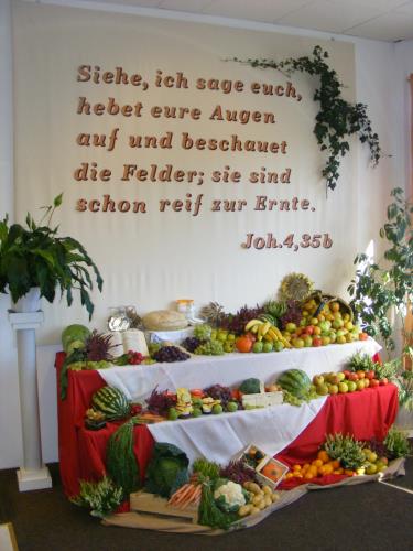Ernte und Erntedank.Wir haben Grund, Gott täglich für Seine Gaben zu danken. Es ist wichtig, auch in unserer Wohlstands-gesellschaft daran zu denken, dass alles von Gott kommt und wir auf Ihn angewiesen sind. Es gibt aber auch Saat und Ernte im geistlichen Bereich, was Ruhid in seiner Predigt am Vormittag heraustellte. In Liedern und Anspielen wurden verschiedene Seiten dieses Themas von der Jugend und den Kindern beleuchtet. Am Nachmittag ging es in der Predigt von Ralf um die Frucht des Geistes, die manchmal im Verborgenen reift und trotzdem von Gott gesehen wird. Wir sind Gott dankbar, dass wir diesen Tag in der Gemeinschaft unter Seinem Wort bei Essen und Trinken bei gemütlichem Beisammensein erleben durften. (EK)