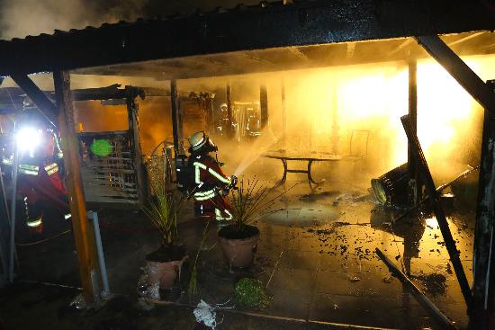 Foto_Thomas_Nyfeler_Husumer_Strasse_04Datum: 21.04.2018, gegen 23:35 Uhr · Ort: Neumünster, Faldera, Husumer Straße 49 · Fotos: Thomas Nyfeler/Text: Maria Nyfeler · Explosion in Carport – Wohnhäuser konnten geschützt werden · Neumünster/Faldera – (Maria Nyfeler) Am Samstagabend, gegen 23:35 Uhr, wurde die Berufsfeuerwehr Neumünster mit dem Einsatzstichwort „Explosion in einem Carport“ in die Husumer Straße in Faldera gerufen. Als die Beamten der Berufsfeuerwehr Neumünster eintrafen stand das Carport bereits in Vollbrand, die Feuerwehr Neumünster Mitte wurde mit dem Stichwort „Feuer1“ mit alarmiert und kam ebenfalls zur Unterstützung mit zwei Fahrzeugen an die Einsatzstelle. Den Feuerschein hatte man schon bei der Anfahrt der Einsatzkräfte von Weitem sehen können. Die Einsatzkräfte bildeten zwei Abschnitte, von denen aus sie das Feuer mit zwei B- und einem C-Rohr mit drei Trupps unter schwerem Atemschutz und zwei Sichertrupps löschten. Dank des schnellen Eingreifens der Feuerwehren konnte verhindert werden, dass die Flammen auf eines der nahe gelegenen Wohnhäuser übergriffen. Durch die enorme Hitze wurden allerdings die Nachbarcarports sowie die Zaunwandungen stark beschädigt. Ursache für das Feuer, laut Angaben der Feuerwehr war eine Gasflasche, die wahrscheinlich bei einem Druckablass in Brand geraten ist. Sie wurde, mit einer zweiten Gasflasche, die laut Augenzeugen explodiert sein soll, im Gartenteich des Grundstückes gekühlt, um weitere Gefahren zu vermeiden. Auch wenn das Feuer schnell gelöscht war, die Nachlöscharbeiten der Glutnester dauerte noch bis in die frühen Morgenstunden. Die Bewohner wurden vom Rettungsdienst betreut, die Kriminalpolizei ermittelt nun die genaue Brandursache.
