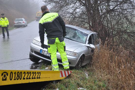 Fotos: TBF/Holger Kröger – In der Straße Vierruten in Lübeck kam eine Frau auf spiegelglatter Straße ins Rutschen. Sie schleuderte in einen Graben und danach gegen einen Baum.Die Straße musste wegen extremer Eisglätte voll gesperrt werden. In dem Pkw befanden sich noch 2 Kinder. Die Fahrerin stand unter Schock.