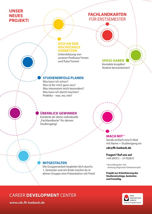 Die Leitung des Projekts hat Dr. Sonja Beer (CDC), Tel.: 0451 – 31702811, cdc@fh-luebeck.de. Das CDC-Projekt „Fachlandkarten“ sucht Tutor*innen, die die Erstsemesterstudierenden begleiten.