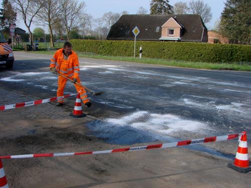 Text: hanseatic news – Fotos: TBF/Holger Kröger – Unbekannte haben vermutlich in der Nacht von Freitag auf Samstag am Krummesser Baum an der Abzweigung nach Kronsforde weiße Farbe über die Fahrbahn verschüttet. Der Fahrrad- und Fußweg wurden mit schwarzer Dachfarbe verunreinigt. Die Lübecker Polizei sperrte den Bereich für Fahrradfahrer und Fußgänger ab. Ein Mitarbeiter der Strassenmeisterei Lübeck hat vor Ort einige Flächen mit Bindemitteln aufgefangen. Desweiteren wurden Warnschilder, die auf die Verschmutzung hinweisen, aufgestellt. Eine Spezialfirma wurde nun beauftragt, um die Strasse sowie Fahrrad- und Fußweg zu reinigen.
