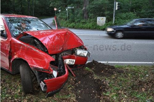 Foto: TBF/Holger Kröger – Lübeck (ots) – Am Mittwoch, 29. August 2012, wurde eine Autofahrerin bei einem Unfall in Lübeck schwer verletzt. Sie verursachte den Unfall allein, andere wurden nicht verletzt. Gegen 19:00 Uhr wurde der Unfall der Lübecker Polizei gemeldet. Vom Wesloer Weg kommend wollte die Fahrerin eines roten Seats an der dortigen Ampel stadteinwärts nach links in die Wesloer Landstraße einbiegen. Es kann nicht ausgeschlossen werden, dass die Frau ihren Pkw mit zu hoher Geschwindigkeit in die Kurve lenkte, als sie nach rechts heraus getragen wurde und von der Fahrbahn abkam. Sie verlor die Kontrolle über ihr Auto und fuhr zunächst über eine Bankette. Während der Pkw einen ersten Baum nur streifte, stoppte ein nächster die Fahrt. Es kam zu einem Frontalzusammenstoß. Die Fahrerin verletzte sich bei dem Unfall schwer und kam mit Frakturen und diversen Prellungen in die Lübecker Universitätsklinik, wo sie stationär aufgenommen wurde. Das Unfallfahrzeug erlitt Totalschaden und war unter anderem bis zur Mitte der Motorhaube eingedellt. Es musste abgeschleppt werden. Das 3. Polizeirevier Lübeck führt die Ermittlungen.