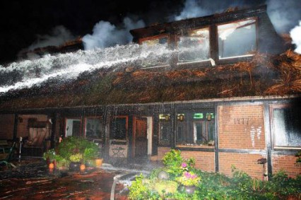 Fotos: Daniela Nyfeler / Thomas Nyfeler – In ein Reetdach Haus aus dem Jahre 1977 in Johannisberg hat heute Morgen am 27. August gegen 1.30 Uhr der Blitz eingeschlagen. Das Haus stand in kürzester Zeit in hellen Flammen, die meterhoch in den Himmel stiegen. Und schon in der Innenstadt in Burg sichtbar war. In dem Haus waren zum Zeitpunkt des Einschlages nach bisherigen Erkenntnissen sechs Personen, die sich unverletzt in Sicherheit bringen konnten.