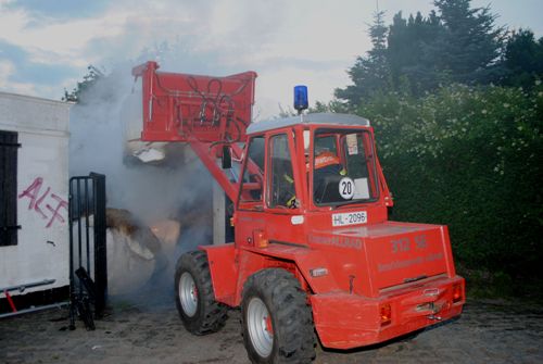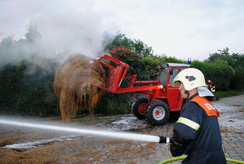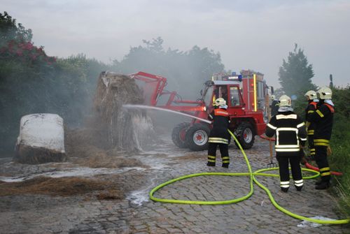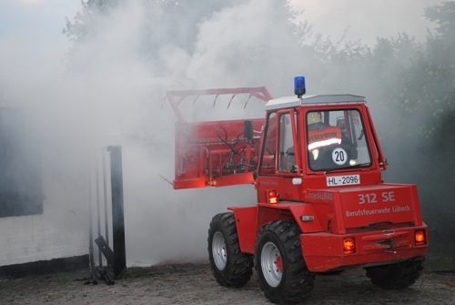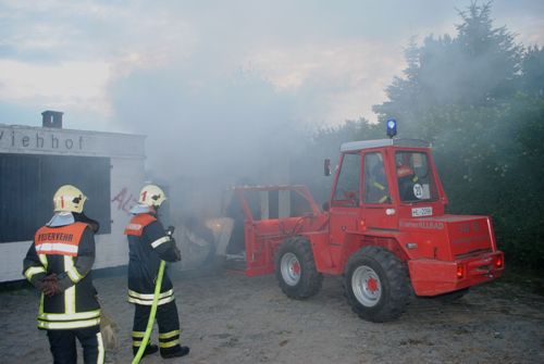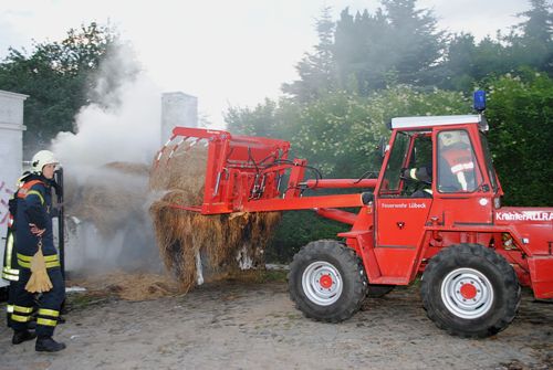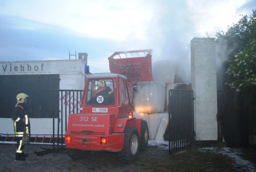 Fotos: Holger Kröger – In der Lübecker Katharinenstraße kam es gestern zu einem Feuer im dortigen Viehhof. Die Feuerwehr rückte zum Löschen aus, die Einsatzkräfte konnten ein Übergreifen des Feuers auf einen nebenstehenden Schuppen verhindern. Es brannten 20 Ballen à je 500 Kilogramm, die gelöscht werden mussten. Verletzt wurde niemand. Zum Einsatz kam ebenfalls ein kleiner Radlader.Durch das Feuer wurde auch eine in der Nähe sich befindliche Wasserleitung beschädigt. Durch die Hitze ist wohl eine Lötstelle gerissen, das austretende Wasser hat das Feuer zusätzlich gelöscht.Im Laufe des Morgens wurde die Brandstelle erneut untersucht, ob wirklich nichts mehr brennt.Die Höhe des entstandenen Schadens ist nicht bekannt.