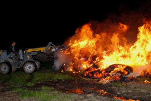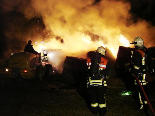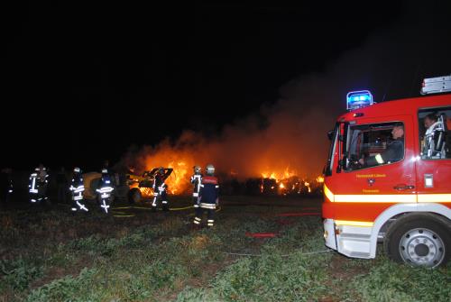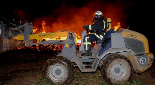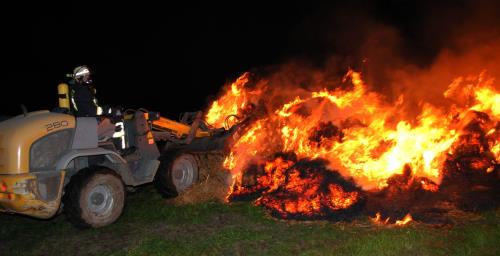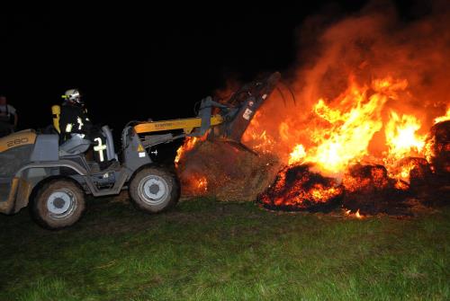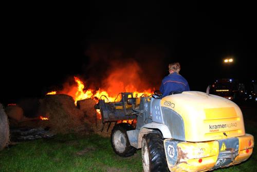 Fotos: TBF/Holger Kröger – In der Nacht zu heute, gegen 3 Uhr, kam es in Hamberge/Poggenpohl zu einem Feuer. Es brannten 30 Ballen Stroh, der Feuerschein war schon von der A20 aus zu sehen. Die Feuerwehren Lübeck, Hamberge und Morrgarten waren eingesetzt, hatten das Feuer relativ schneller unter Kontrolle, weil sie einen Radlader zum Auseinanderziehen der Ballen benutzten und so verhinderten, das weitere Strohballen in Mitleidenschaft gezogen wurden. Menschenleben waren nicht bedroht.