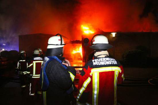 Text: TBF, Fotos: Thomas Nyfeler · Neumünster/Einfeld: Ein Grossfeuer zerstört ein Vereinsheim · Am Dienstagabend ist in Neumünster-Einfeld das Vereinsheim des Turn- und Sportvereins völlig abgebrannt. Wenig später als 18 Uhr ging ein Notruf bei der Feuerwehr ein. Nach Angaben der Polizei in Neumünster hatte der Pächter des Heimes mit einem Bunsenbrenner nahe des Heims Unkraut vernichtet. Dabei hat sich hinter einer metallischen Außenverkleidung des Gebäude das Haus entzündet, so die Beamten. Die Flammen breiteten sich rasend schnell aus.Die Dämmung des Vereinsheims machte es der Feuerwehr sehr schwer, den Brand in den Griff zu bekommen. Über 120 Feuerwehrleute waren bis in die Nacht zum Mittwoch im Einsatz. Die Löscharbeiten waren sehr schwierig, so ein sprecher, da die Dämmung des Hauses nicht schnell genug gelöscht werden konnte. Menschen wurden nicht verletzt.