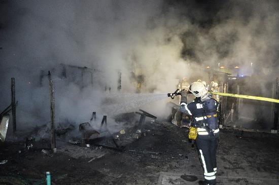 Feuer Garten L. 047© TBF/Holger Kröger – Lübeck.  Am späten Dienstagabend sind mehrere Schuppen auf dem Gelände des Kleingärtnervereins Marli am Lilienweg abgebrannt. Die Ursache ist noch ungeklärt, verletzt wurde niemand. Der Besitzer der Schuppen hatte in seiner Gartenlaube gesessen und gelesen, als er plötzlich einen lauten Knall hörte. Er stand auf und sah aus dem Fenster und traute seinen Augen nicht: Seine Schuppen, die er auf seiner Parzelle aufgebaut und eingerichtet hatte, standen lichterloh in Flammen.