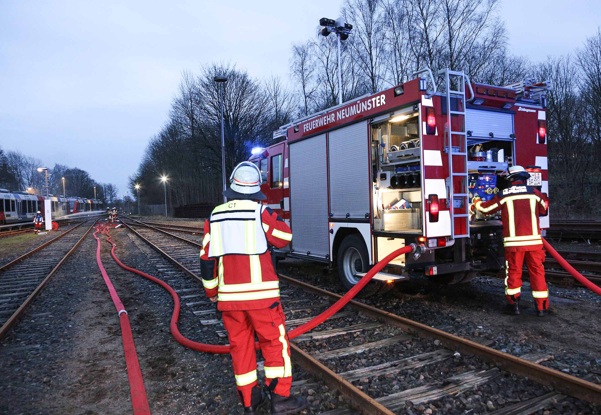 “Zum Bilderbogen”Dort brannte ein Personenzug der AKN, welcher dort auf einem Gleis abgestellt wurde. Der Zug brannte unter dem Personenabteil im Bereich der Heizung in der Karosserie. Die Feuerwehr leitete den Löschangriff zunächst aus der Ferne ein, bis die Gleisanlagen als sicher freigegeben wurden und löschte dann mit Schwerschaum im Zangenangriff, so Einsatzleiter Marc Kutyniok von der Berufsfeuerwehr Neumünster. Eine besondere Schwierigkeit war, dass Betriebsstoffe aus dem Triebwagen tropften, welche ebenfalls in Brand gerieten. Trotzdem hatten die Einsatzkräfte das Feuer schnell unter Kontrolle. Zum aktuellen Zeitpunkt stand der Zug auf dem Gelände der AKN und es befanden sich keine Personen im Zug.