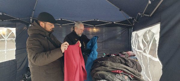 Und auch diesmal kamen die fröstelnden schon wartenden armen Menschen zum Zelt und holten drängelten sich, um warme Kleidung zu bekommen. Mehrere Zuschauer sahen sich das Spektakel an und kamen dann auf die Helfer zu, ob sie auch Kleidung vorbeibringen dürften, sie hätten noch viele Winterkleidung im Schrank, die sie gerne bringen wollten. „Zum Wegwerfen sind sie viel zu schade“, sagten sie.