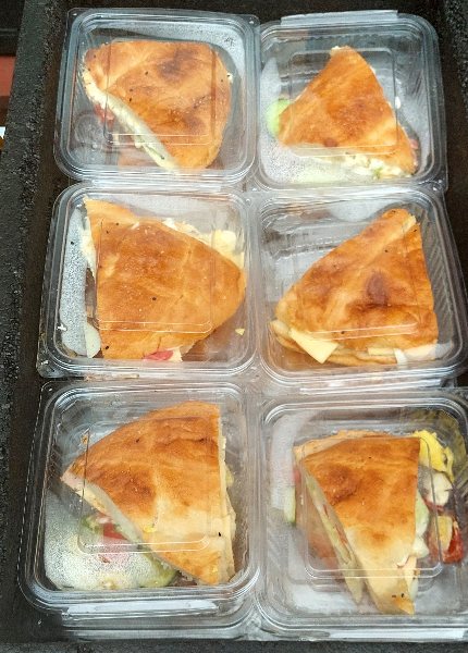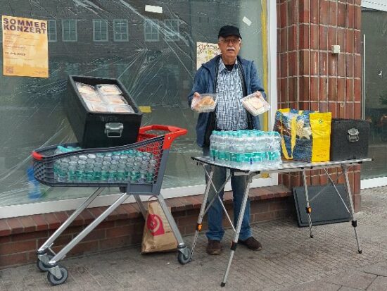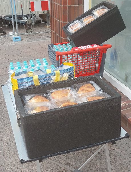Dort stellten beide den Tisch auf, kauften schnell bei REWE Halbliter-Flaschen mit Wasser und bauten die Kühlkisten und das Wasser auf. Danach hatte der Helfer einen Termin und so verteilte der Vorsitzende 3 Stunden lang die Sandwiches und 1/2 Liter Flaschen Wasser. Gegen Mittag geschah etwas unerwartetes!