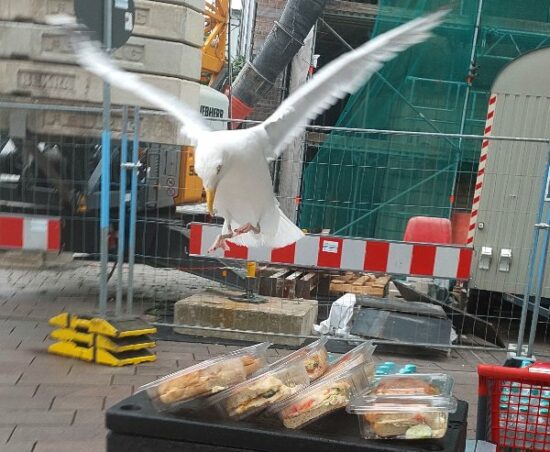 Der Vorsitzende Wolfgang Freywald: „Ich hatte mich gerade für eine kleine Pause hingesetzt, als eine Möwe Stück für Stück, genau aufpassend, wie ich reagiere, angelaufen. Ich verhielt mich ganz ruhig, sie kam immer näher, kuckte mich immer wieder an, dann machte sie den ersten Versuch und flog stracks auf die Kiste mit den ausgestellten gut verpackten Sandwiches. Ich griff blitzschnell zum Handy und fotografierte das weitere Geschehen. 4 Versuche machte die Möwe, um sich ein Sandwich zu schnappen, hackte mehrmals auf der durchsichtigen festen Verpackung herum, kam aber nicht zum Ziel, dann gab sie auf und flog erfolglos auf eine Steele.“