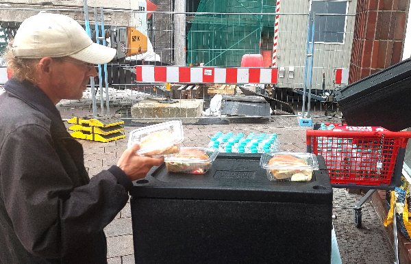 (TBF) Am Sonnabend war es wieder soweit: Nach einer Pause von Mai bis Juni wurden von der Fides Humanitas Stiftung wieder Sandwiches verteilt. Eine Helferin mußte krankheitsbedingt absagen, leider auch der Stifter, der sich zu Hause seinen Zeh gebrochen hatte und mußte darum ausfallen. Der Vorsitzende traf einen Bekannten bei der Bäckerei in der Beckergrube und bat ihn, die Kühlkisten – bei REWE genau gegenüber -, mit in sein Auto zu laden und am Klingenberg kurz mitzuhelfen.