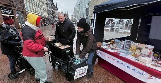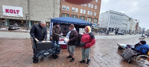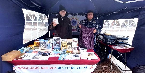 (TBF) Auch diesmal war es durch die winterlichen Temperaturen recht kalt am Klingenberg in Lübeck. Das Aufstellen des Zeltes war wieder mühsam, die Auslage der Informationsschriften brauchten Zeit, denn die Hände wurden schnell eiskalt und eine Plastik Box brach wegen der Kälte auseinander.Da wir wieder warme Kleidung verteilten und es zusätzlich erstmals in diesem Jahr auch wieder Sandwiches gab, dachten wir Helfer, es würde gleich am Anfang ein Ansturm sein, doch wir mußten gut 1 1/2 Stunden warten, bis die ersten wohnungs- und obdachlosen und armen Menschen zu uns gefunden hatten und wir sie mit Wasser und Essen versorgen konnten.