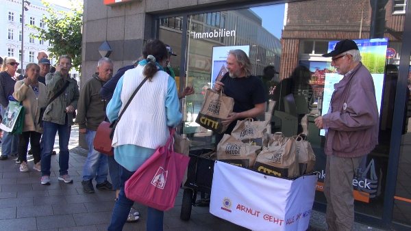 Text und Fotos: TBF · Gestern am 16. September 2023 wurde wieder in Lübeck Carepakete-Tüten-Paket mit einem Bollerwagen an die bitter armen Menschen verteilt. 60 Carepakete waren es mit Lebensmitteln, sowie Sachen des täglichen Bedarfs, darunter war die 500. Tüte. Alles ist inzwischen sehr viel teurer geworden und für diese notleidenden Menschen sind die Lebensmittel kaum noch erschwinglich! Sie benötigen dringend Hilfe und diese bekommen sie von der Fides Humanitas Stiftung.
