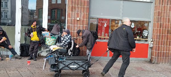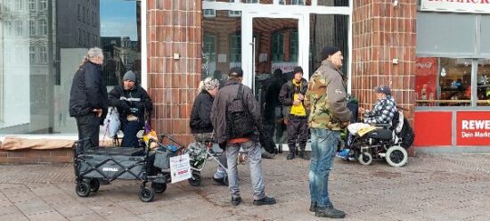 Ich übernahm dann die Kleiderverteilung, und Oliver Siemsen nahm den Bollerwagen mit dem Wasser und den Schwartauer Corny-Riegel und begann seine Stadtreise durch die City bis zum Bahnhof. Gegen 13.30 Uhr war er dann wieder da und wir machten beide eine Kaffeepause.