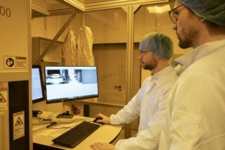 Gregor Knoll und Fabian Henk stehen in einem gelb beleuchteten Raum und öffnen die Klappe eines großen 3D-Druckers. Knoll und Henk sind Doktoranden im Forschungsprojekt LIMESOPTIA, das bis Mitte 2027 vom Bundesministerium für Forschung, Technologie und Raumfahrt (BMFTR) gefördert wird. Knoll legt ein kleines Deckglas in den 3D-Drucker, auf dem ein Tropfen aus einem Polymer aufgebracht ist. „Dadurch, dass wir die Linsen im 3D-Drucker herstellen, haben wir viel mehr Möglichkeiten die Form frei zu bestimmen, als zum Beispiel im teuren Spritzgussverfahren“, sagt der studierte Ingenieur für Physikalische Technik und Mechanical Engineering.