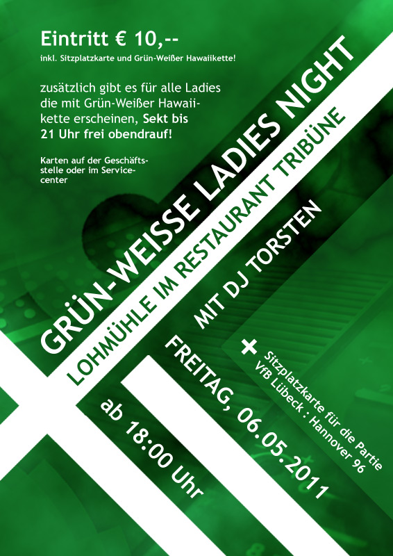 Schon vor dem nächsten Heimspiel gegen Hannover 96 II ist im dekorierten Restaurant Tribüne mächtig was los: Der VfB lädt zur grünweißen Ladies Night ein. Ab 18 Uhr wird DJ Torsten (V.I.P. Raiders) dort einheizen und auf das Spiel einstimmen. Im Mittelpunkt stehen dabei alle grünweißen Ladies! Für zehn Euro erhalten alle Frauen am Freitag eine Karte für die Sparkassen-TRIBÜNE, um das Spiel zu verfolgen. Dazu gibt es eine grünweiße Hawaiikette, Sekt frei bis 21 Uhr und ein VfB-Ladies-Cap!Auch nach dem Spiel wird DJ Torsten bei fairen Getränkepreisen für ein stimmungsvolles Flair sorgen! Gemeinsam wollen wir auf drei Punkte anstoßen und die Nacht zum Tage machen!