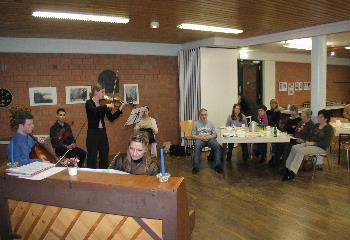 Foto: „Wiener Konfekt“ – musikalische Einladung zum Spenden für das Kaliningrader Jugendprojekt „Jablonka“ und dessen Straßenkinder. Im Hintergrund u. a. die russischen Gäste und ihre Begleitung.