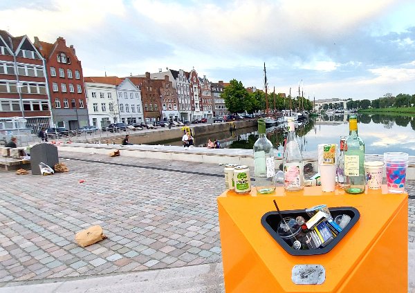 Text und Fotos: TBF/Holger Kasnitz · Heute am Sonntag, bei meinem Morgenspaziergang durch Lübeck, schaute ich mal am Drehbrückenplatz vorbei. Einige Nachtschwärmer ließen noch die vergangene Nacht ausklingen. Es sah dort wirklich schlimm aus. Die gesamte Fläche war voll mit Hinterlassenschaften der vergangenen Nacht. Flaschen, Becher und Pappkartons standen massenhaft rum. „Da hat sich die Hansestadt Lübeck eine neue Müllkippe gebaut.“ Nicht weit davon entfernt, in der Clemensstraße, war es sauber, dort konnte ich keinen Müll entdecken. Ich bin dann auf meinem Weg am Stadtpark vorbeigekommen, auch hier sah es sauber aus. Im Marlipark (Drägerpark) lagen einige Pizzakartons auf der Wiese. Stephanie Kornstaedt vom Stadtgrün und Verkehr, wie das ehemalige Grünflächenamt der Hansestadt Lübeck jetzt heißt, hatte schon das Kinderplanschbecken gereinigt und war damit beschäftigt, die Mülleimer im Park zu leeren und den Müll von den Rasenflächen zu entfernen. „Das ist hier nicht so viel, aber drüben auf der Wiese am Tor der Hoffnung, haben mein Kollege und ich bestimmt zwei Stunden zu tun, um den ganzen Müll auf unseren Wagen zu verfrachten.“ Ihren Kollegen sah ich noch auf dem Kinderspielplatz bei Reinigungsarbeiten.