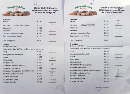 „Bitte 2 mal Frühstück,“ sagten wir wie aus einem Mund. „Suchen Sie sich Brötchen nach Wahl, Wurst, Käse, oder etliches Anderes aus, wir berechnen nach Artikeln,“ war die Antwort der Verkäuferin. Dann gab sie uns jeweils einen Zettel, auf dem viele Beläge draufstanden und man nur dazu schreiben brauchte, wieviel man jeweils davon haben wollte.