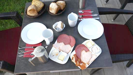 Und der Preis? Ich zahlte für mein Frühstück 6,44 Euro, Holger 5,44 Euro. Das war ein angemessener Preis für einen leckeren Früstücksschmaus. Über die dekorative Beilage (Gurken, Tomaten etc.) lässt sich streiten, es war nämlich nichts davon auf den Tellern, Servietten fehlten zuerst, aber auf Nachfrage wurde das schnellstens korrigiert.