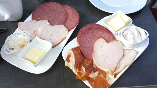Holger nahm 4 Scheiben Opas Liebste (feine Mettwurst), 1 Scheibe geräucherte Pute, 1 Glasschälchen Waldorfsalat. Ich nahm zweimal Butter, 2 Scheiben Schinken (Serrano), 4 Scheiben Opas Liebste (feine Mettwurst), 1 Scheibe geräucherte Pute und 1 Glasschälchen Fleischsalat. Dann ließen wir es uns schmecken. Ja, so kann man es sagen, denn die Qualität der Ware war hervorragend und wirklich lecker, die Brötchen knackig und frisch.