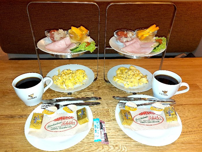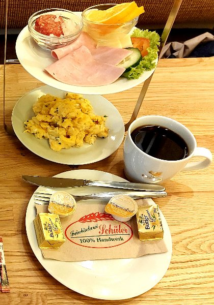 Es ist in der Aufschnittauswahl nicht so üppig wie bei Knaack, aber es gibt eben Rührei dazu und das Frühstück in dieser Zusammenstellung ist einfach lecker.