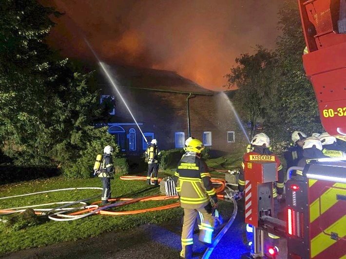 Kisdorf (ots) – Am Mittwochabend kam es um 20:15 Uhr zu einem Großfeuer in der Gemeinde Kisdorf im Kreis Segeberg. Mit dem Stichwort FEU G (Feuer-größer als Standard) wurde die Freiwillige Feuerwehr Kisdorf unter der Leitung von Wehrführer Lars Lohse zu einem Dachstuhlbrand in die Straße „Rugenvier“ alarmiert. Durch die Kooperative Regionaleistelle West wurde ebenfalls die Freiwillige Feuerwehr Kaltenkirchen parallel alarmiert, um zeitnah ein Hubrettungsmittel an die Einsatzstelle zu bekommen. Bereits auf der Anfahrt war das Ausmaß des Feuers erkennbar und der Einsatzleiter entscheid sich umgehend die Ortswehr aus Henstedt mit einer zweiten Drehleiter an die Einsatzstelle zu bekommen und die Alarmstufe auf „FEU3“ (Feuer- 3 Löschzüge) zu erhöhen. Bei dem Objekt handelt es sich um einen landwirtschaftlichen Betrieb mit angeschlossener Wohneinheit. In den betroffenen Stallungen befanden sich zum Zeitpunkt des Brandausbruches keine Tiere, die Bewohner konnte das Objekt eigenständig verlassen. In der Spitze wurden sieben handgeführte Strahlrohre, zwei Wenderohre und ein Wasserwerfer eingesetzt, um den Flammen Herr zu werden. Das größte Problem an der Einsatzstelle gerade in der Initialphase lag in der Wasserversorgung. Die Wasserversorgung musste mit 4000 Meter B-Schläuchen aufgebaut werden, um die Einsatzkräfte am Brandobjekt mit Wasser zu versorgen. Zwischenzeitlich wurde der Wasserdruck durch den Versorger erhöht. Ein Innenangriff war kaum möglich, sodass sich die Maßnahmen darauf konzentrierten das Feuer von außen zu bekämpfen. Im frühen Einsatzverlauf griff das Feuer vom Stall auf das Wohngebäude über. Eine Öffnung des Daches war nötig, um das Feuer im Wohngebäude weiterhin effektiv zu bekämpfen. Um das im Stall gelagerte Stroh zu entfernen wurde ein Bagger an die Einsatzstelle geordert damit dieses auf einer anliegenden Koppel abgelöscht werden konnte. Die Bevölkerung wurde mittels der Warn-App „Nina“ aufgrund der starken Rauchentwicklung aufgefordert Fenster und Türen geschlossen zu halten. Die Alarmstufe wurde in der Nacht noch einmal auf „FEU4“ (Feuer- 4 Löschzüge) erhöht, um bei diesem Kräftezehrenden Einsatz die Atemschutzgeräteträger auszutauschen. Um 03:42 Uhr konnte der Leitstelle „Feuer aus“ gemeldet werden. Nun galt es noch Nachlösch- und Aufräumarbeiten durchzuführen. Insgesamt dauerte dieser Einsatz über 11 Stunden an und mehr als 140 Einsatzkräfte waren an diesem Einsatz beteidigt. Am Donnerstagmorgen konnte die Einsatzstelle in Kisdorf um 07:00 Uhr an die Polizei übergeben werden und die letzten Einsatzkräfte rückten ein. Gegen 10 Uhr wurde die Feuerwehr Kisdorf erneut zur Einsatzstelle alarmiert, um das Brandobjekt auf letzte Glutnester zu durchsuchen und diese abzulöschen. Verletzt wurde bei diesem Einsatz niemand. Zur Brandursache und Schadenshöhe können seitens der Feuerwehr keine Angaben gemacht werden. Eingesetzte Kräfte: Freiwillige Feuerwehr Kisdorf Freiwillige Feuerwehr Kaltenkirchen Freiwillige Feuerwehr Henstedt-Ulzburg, Ortswehren Henstedt und Götzberg Freiwillige Feuerwehr Oersdorf Freiwillige Feuerwehr Winsen Freiwillige Feuerwehr Wakendorf II Freiwillige Feuerwehr Struvenhütten-Hüttblek Kreisfeuerwehrband Segeberg: Rufbereitschaft mit Wechselladerfahrzeug, Pressesprecher Rettungsdienstkooperation In Schleswig-Holstein: Rettungswagen Polizei Segeberg und Pinneberg Energieversorger