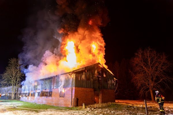 Rickling (ots) Am späteren Freitagabend, dem 14.02.2025 kam es in Rickling zu einem Großeinsatz der Feuerwehr. Gegen kurz nach 20:25 Uhr wurde die Freiwillige Feuerwehr Rickling mit dem Einsatzstichwort „FEU K“ (Feuer, kleiner als Standard) alarmiert, nachdem ein Notrufteilnehmer aus der Ferne eine Rauchentwicklung sowie Flammen vermeintlich an einem Baum wahrnahm.Nachdem ein Kamerad der Freiwilligen Feuerwehr Rickling auf dem Weg zur Feuerwache war, sah dieser eine in Vollbrand stehende Scheune. Durch das Absetzten des Notrufes sowie der neuen Informationen, wurde durch den Leitstellendisponenten das Einsatzstichwort auf „FEU G“ (Feuer, größer als Standard) erhöht.