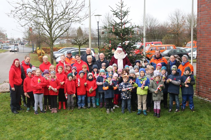 Schleswig (ots) – Schleswig/ Premiere an der Kreisfeuerwehrzentrale in Schleswig. Ein Tannenbaum steht jetzt vor der Kreisfeuerwehrzentrale. Mitglieder der Kinderfeuerwehren aus Lürschau, Jagel und Ostangeln haben in mühevoller Kleinarbeit den Tannenbaumschmuck gebastelt. Zum großen Tannenbaumschmücken kam Kreiswehrführer Mark Rücker mit seinem Stellvertreter Bernd Waschnick, Kreisjugendwart Ralf Hansen und Kreisgeschäftsführerin Anja Engelbrechtsen-Wienk in die Zentrale und waren begeistert von den Anhängern die die kleinsten und jüngsten Feuerwehrmitglieder mit großem Elan an den Baum hängten. Nach dem der Baum fertig geschmückt war, wurde zusammen ein Lied gesungen. Bis zum Ende singen ging leider nicht, das größte Kind, Kreiswehrführer Mark Rücker, erblickte eine große Überraschung, der Weihnachtsmann war da. Die Augen der kleinen wurden immer größer, da der Weihnachtsmann einen gut gefüllten Geschenkesack dabeihatte. Natürlich hatte der Weihnachtsmann für alle Kinder Geschenke mit, so ging kein Kind ohne Geschenk nach Hause. Im Anschluss wurden schöne Gruppenbilder gemacht wurden, ein weiteres Lied gesungen wurde und es gab für die Kinder warmen Kakao.