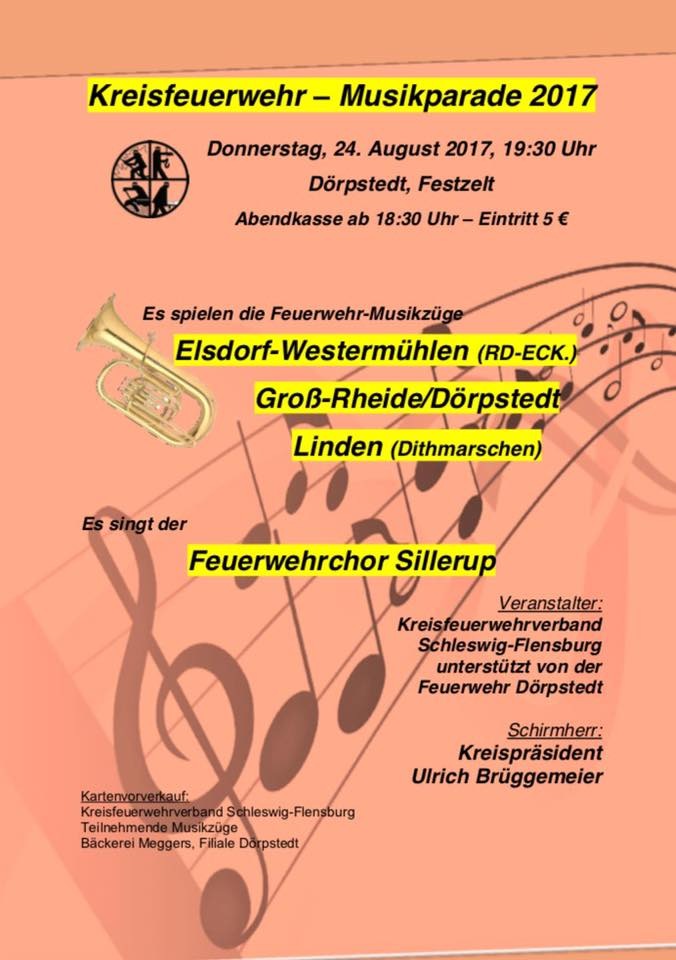 Schleswig (ots) – Wie im vergangenen Jahr veranstaltet der Kreisfeuerwehrverband Schleswig-Flensburg auch in diesem Jahr wieder eine Musikparade. Die Musikparade findet am 24.08.2017 um 19:30Uhr in Dörpstedt auf dem Festplatz statt. In diesem Jahr präsentieren sich die Feuerwehrmusikzüge aus Groß-Rheide/Dörpstedt, Elsdorf-Westermühlen (Kreis RD-ECK), Linden (Kreis Dithmarschen). Aus Sillerup kommt der Feuerwehrchor und singt für die Zuschauer. Kreispräsident Ulrich Brüggemeier hat auch in diesem Jahr die Schirmherrschaft übernommen. Wir bitten die Medien herzlich um Vorankündigung und Berichterstattung. Ebenfalls bitten wir die Medien die vor Ort erscheinen, sich vorher unter florian.boewes@kfv-slfl.de oder 0172-2716737 anzumelden.