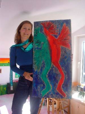 Foto: Die Künstlerin Ina Rathje mit einem Werk:Titel:“Fliegen“ Acryl auf Holz-120cmx50cm