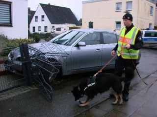 Fotos: TBF/Holger Kröger – Heute Mittag, wollten Polizeibeamte an der Ecke Fackenburger Allee / Bei der Lohmühle einen grauen BMW kontrollieren. Doch der Fahrer hielt nicht an, sondern raste mit seinen Wagen auf dem Gehweg entlang an der Kontrolle vorbei, in Richtung Lohmühlenteller. Im Kreisverkehr fuhr er in den Gegenverkehr und bog in die Stockelsdorfer Straße ein. Von dort raste er auf die A1 in Richtung Norden. Dort verlor die Polizei die spur des BMW.Gegen kurz nach 11 Uhr bekam die Polizei eine Unfallmeldung für die Warthestraße. Dort hatte ein BMW einen Gartenzaun niedergemäht und stand im Mitten im Vorgarten. Der Fahrer war zu Fuß geflüchtet. Die Polizei kam am Unfallort an und setzte einen Spürhund ein, bisher fehlt von dem Fahrer jede Spur.